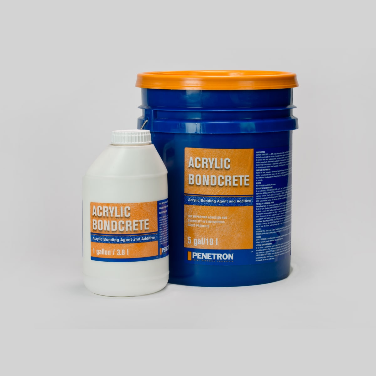 ACRYLIC BONDCRETE – 100% акрилова латексна домішка для підвищення міцності бетону, що також може використовуватися як клейова основа для підвищення адгезії. Матеріал забезпечує підвищення стійкості бетонів до стирання, впливу вологи, кислот та інших водорозчинних хімікатів. Як полімерний модифікатор ACRYLIC BONDCRETE забезпечує кращі показники гідратації цементу та адгезії навіть за умов надтонкого нанесення. Може використовуватися як клеюча основа для влаштування нових цементних покриттів по існуючим.